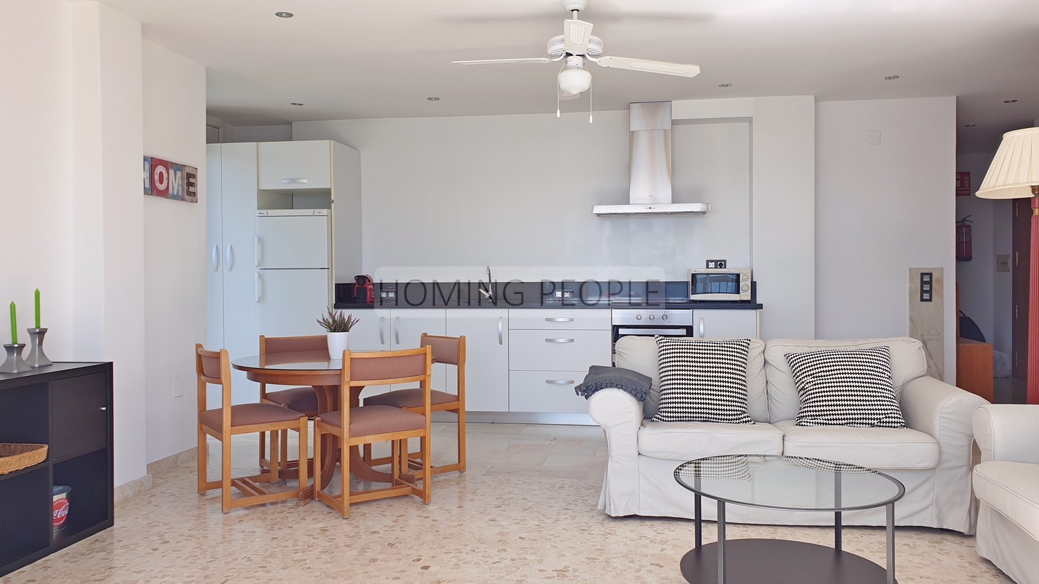 Piso en primerísima línea de playa con orientación suroeste, situado en la tercera planta de un pequeño edificio con ascensor -y plaza de parking opcional. Con un supermercado debajo y un chiringuito enfrente, se encuentra a cuatro minutos a pie de bancos, tiendas, etc.