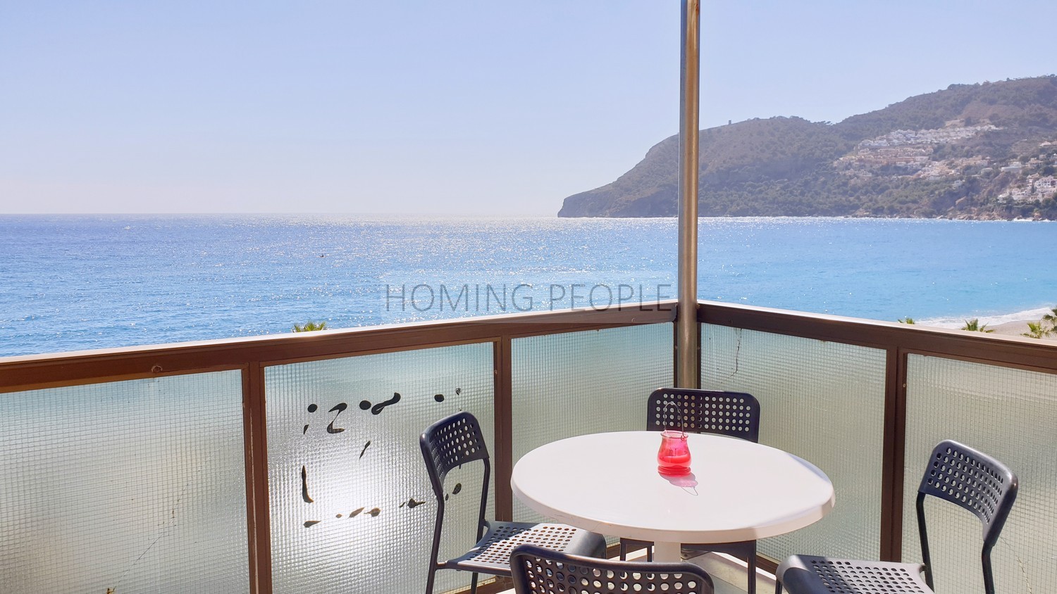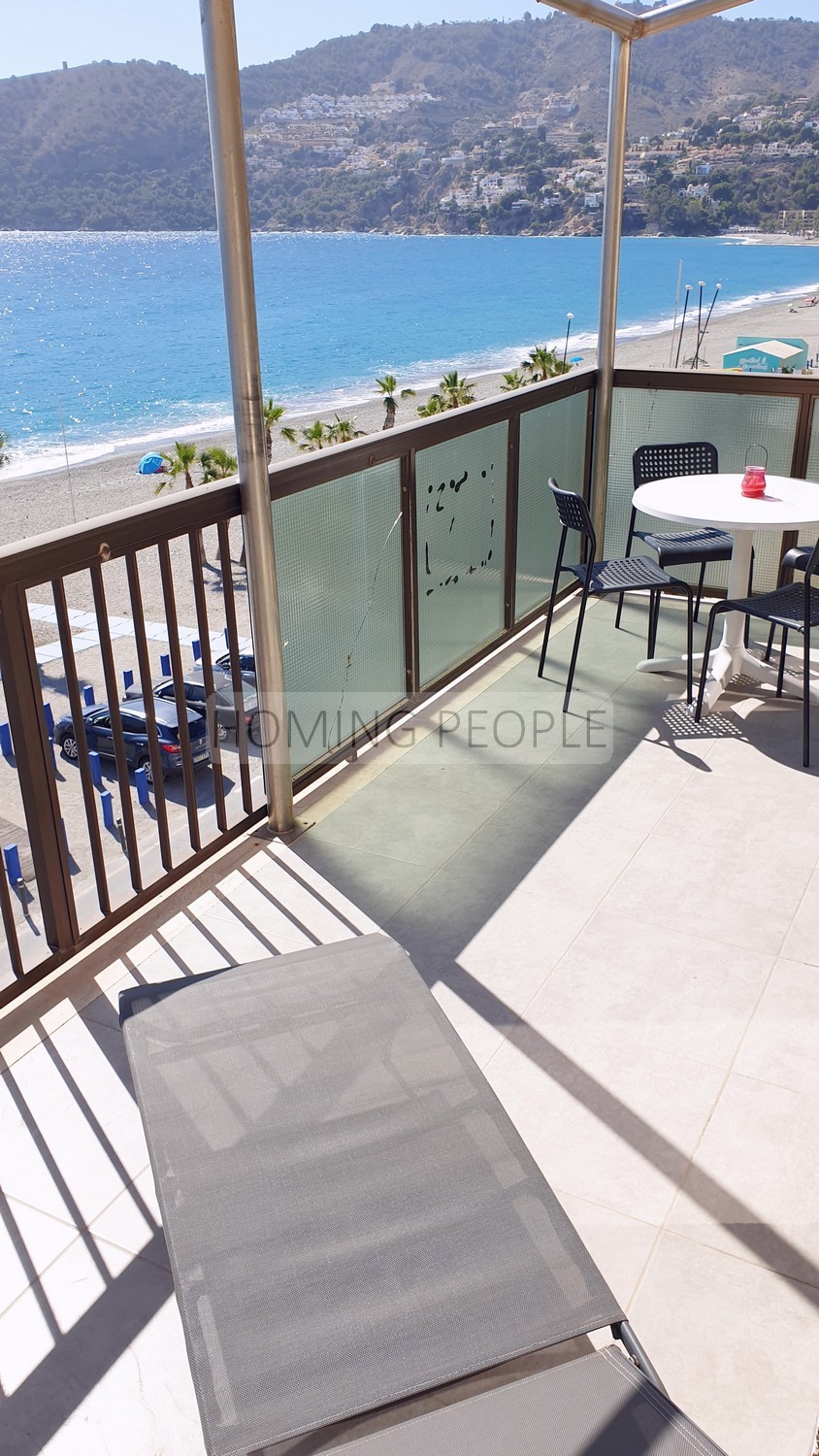 Piso en primerísima línea de playa con orientación suroeste, situado en la tercera planta de un pequeño edificio con ascensor -y plaza de parking opcional. Con un supermercado debajo y un chiringuito enfrente, se encuentra a cuatro minutos a pie de bancos, tiendas, etc.