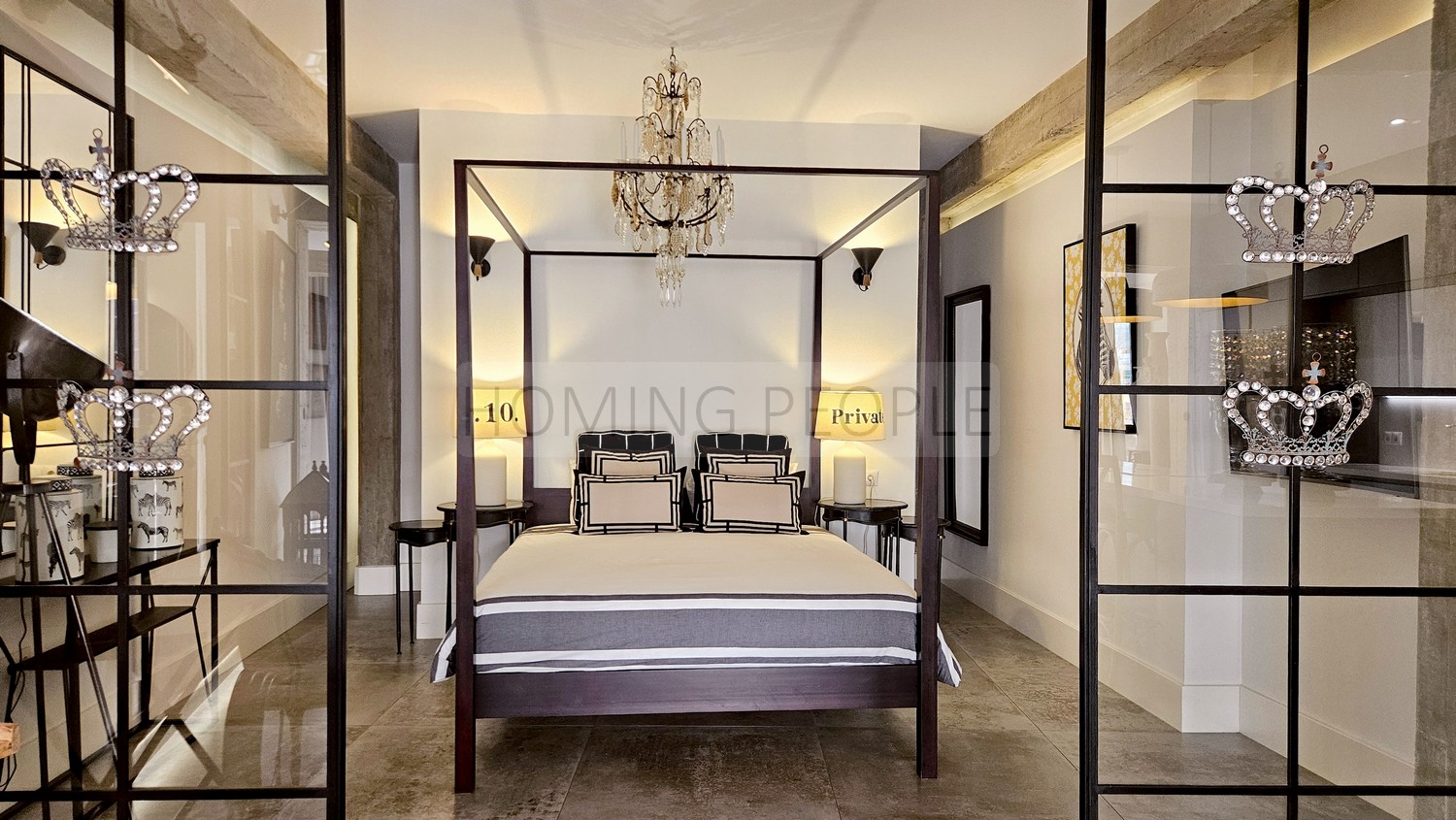 DISTRIBUCIÓN INTERNA. Hall de entrada /pasillo distribuidor con un baño con ducha a la derecha y zona loft que cuenta a un lado con una zona de dormitorio abierto con vestidor completo detrás del cabecero de la cama, y a otro con una segunda zona de vestidor y un aseo. Estas dos zonas abrazan la estancia central: La cocina de diseño totalmente equipada con isla /barra y el salón con cómodos sofás y un gran ventanal -con cortinas, que dota de aire fresco y luz natural a toda la propiedad.